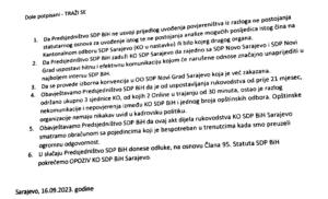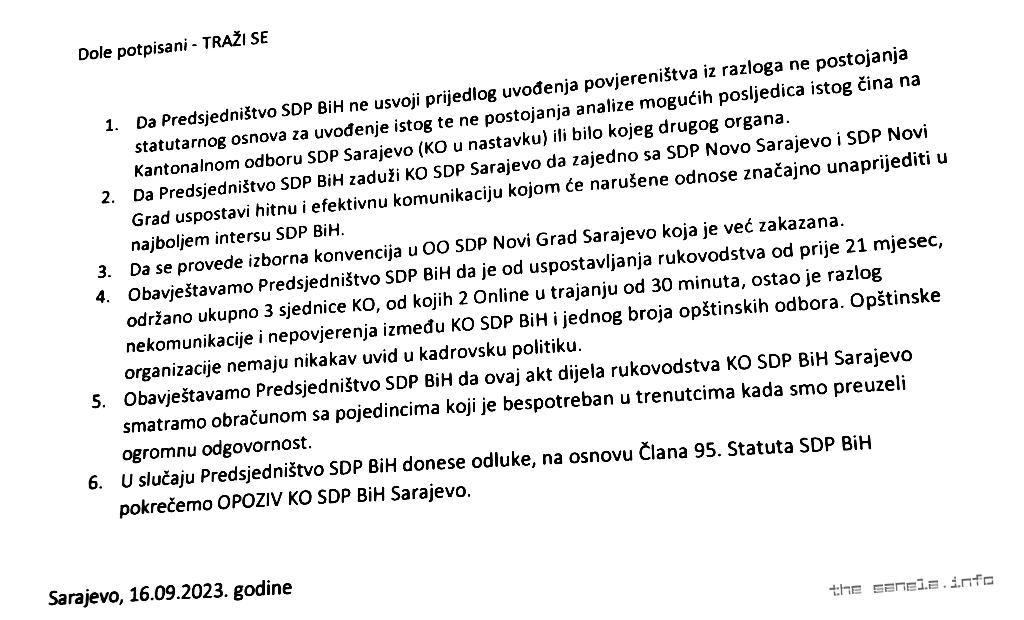 Valter portal je u posjedu kopije pisma u kojem predsjednici OO SDP BiH Centar Igor Stojanović, Novog Sarajeva Samir Suljević, Novog Grada Mahir Delić, Trnova Elvedin Tatarević, te predsjednica OO SDP BiH Ilijaš Selma Alić Barić, od vrha stranke traže zaustavljanje obračuna sa pojedincima koje provodi predsjednik KO Adnan Šteta sa svojim ljudima prema predsjednicima OO Novo Sarajevo i Novi Grad.